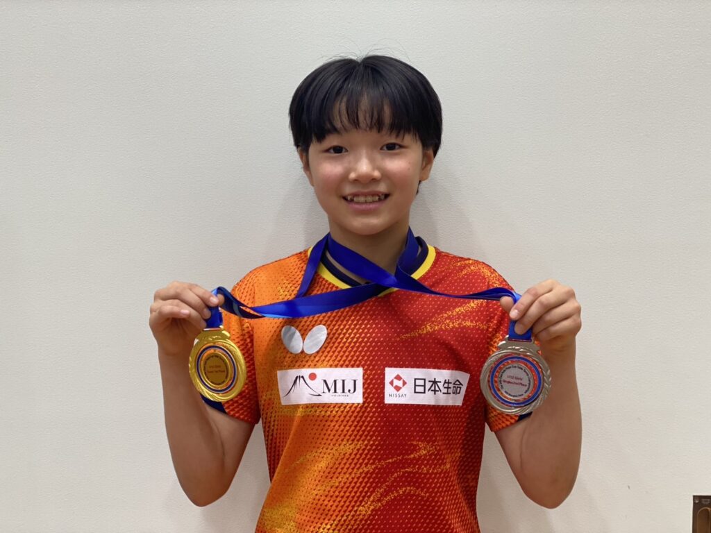 「初めて訪れた上海では、海外の特殊な戦型の選手と対戦も有り、団体は優勝、個人は2位で嬉しかったり悔しかったり楽しい経験をさせて頂きました。次は1月全日本ジュニアも頑張ります!」